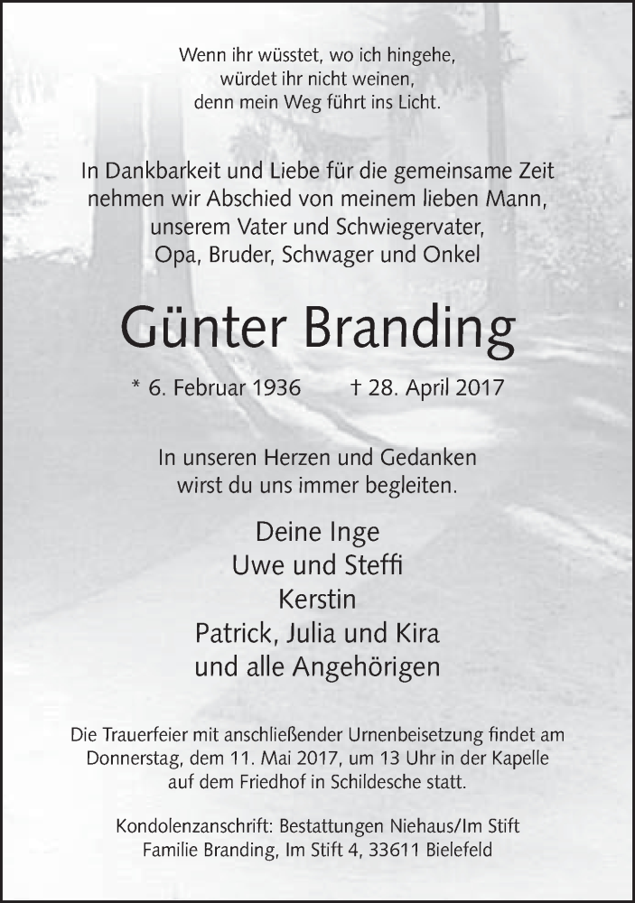 Hier finden Sie alle Traueranzeigen aus der Zeitung, die bisher für Günter Branding erschienen sind. Weitere Traueranzeigen, die in der Zeitung erscheinen, werden hier ebenfalls aufgelistet