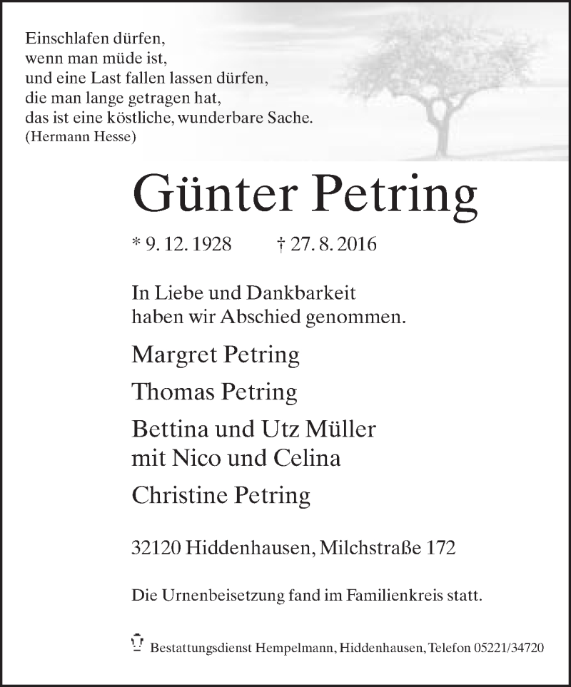 Hier finden Sie alle Traueranzeigen aus der Zeitung, die bisher für Günter Petring erschienen sind. Weitere Traueranzeigen, die in der Zeitung erscheinen, werden hier ebenfalls aufgelistet