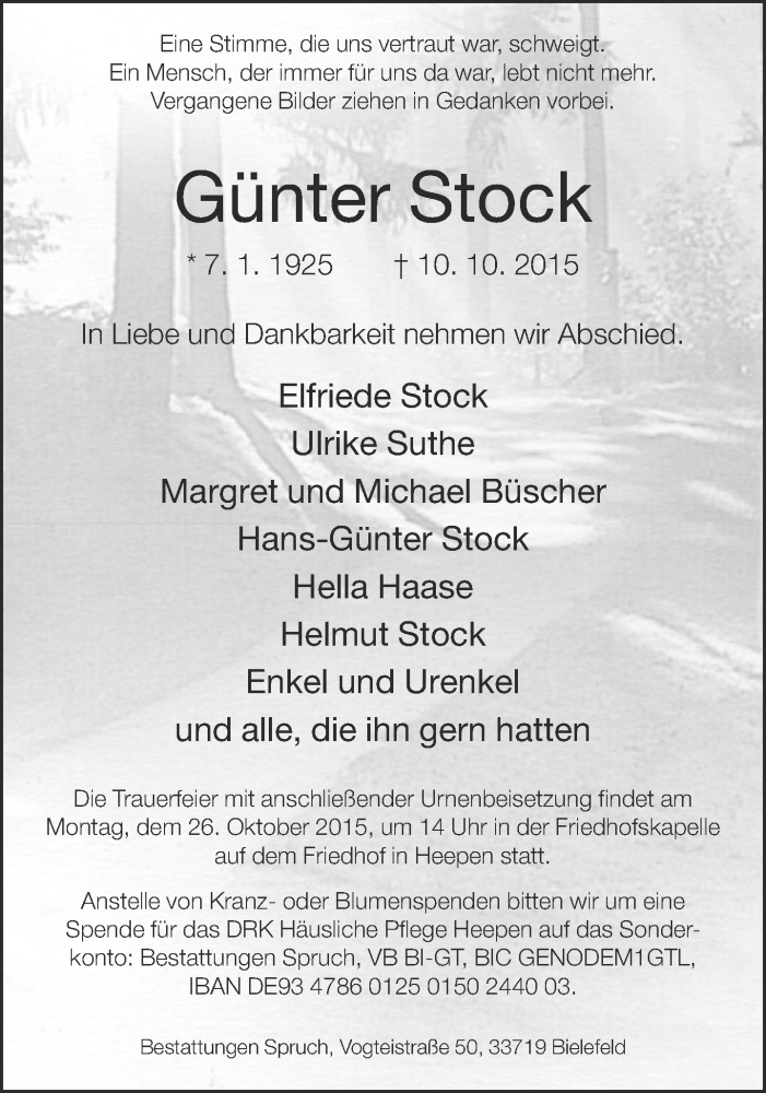 Hier finden Sie alle Traueranzeigen aus der Zeitung, die bisher für Günter Stock erschienen sind. Weitere Traueranzeigen, die in der Zeitung erscheinen, werden hier ebenfalls aufgelistet