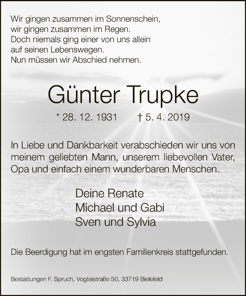 Hier finden Sie alle Traueranzeigen aus der Zeitung, die bisher für Günter Trupke erschienen sind. Weitere Traueranzeigen, die in der Zeitung erscheinen, werden hier ebenfalls aufgelistet