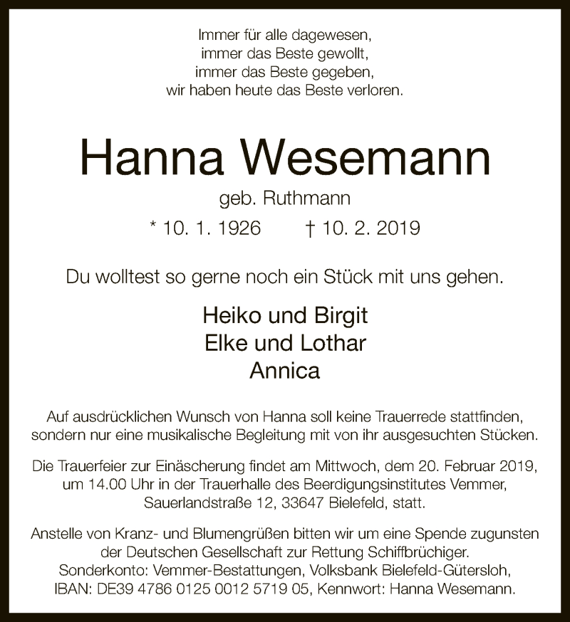 Hier finden Sie alle Traueranzeigen aus der Zeitung, die bisher für Hanna Wesemann erschienen sind. Weitere Traueranzeigen, die in der Zeitung erscheinen, werden hier ebenfalls aufgelistet
