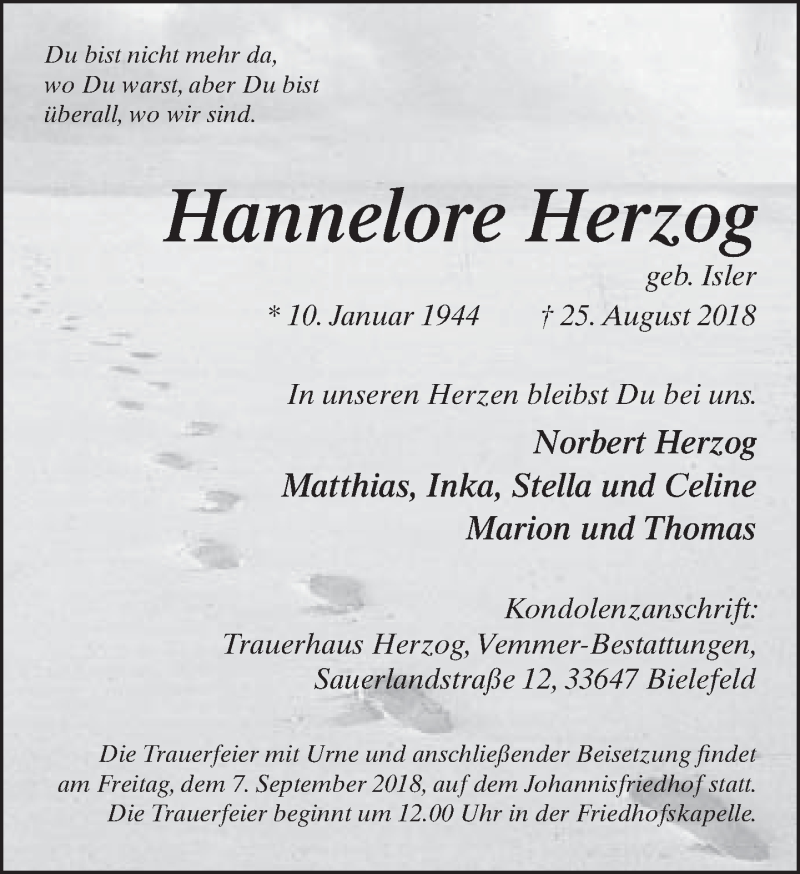 Hier finden Sie alle Traueranzeigen aus der Zeitung, die bisher für Hannelore Herzog erschienen sind. Weitere Traueranzeigen, die in der Zeitung erscheinen, werden hier ebenfalls aufgelistet