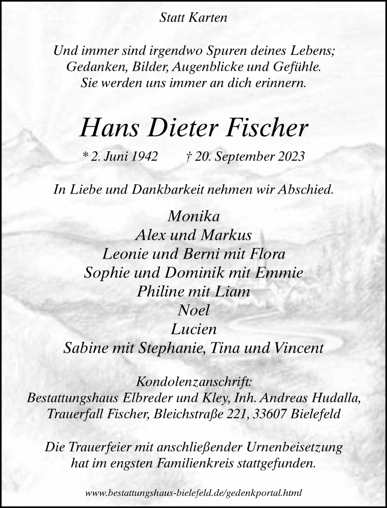 Hier finden Sie alle Traueranzeigen aus der Zeitung, die bisher für Hans Dieter Fischer erschienen sind. Weitere Traueranzeigen, die in der Zeitung erscheinen, werden hier ebenfalls aufgelistet
