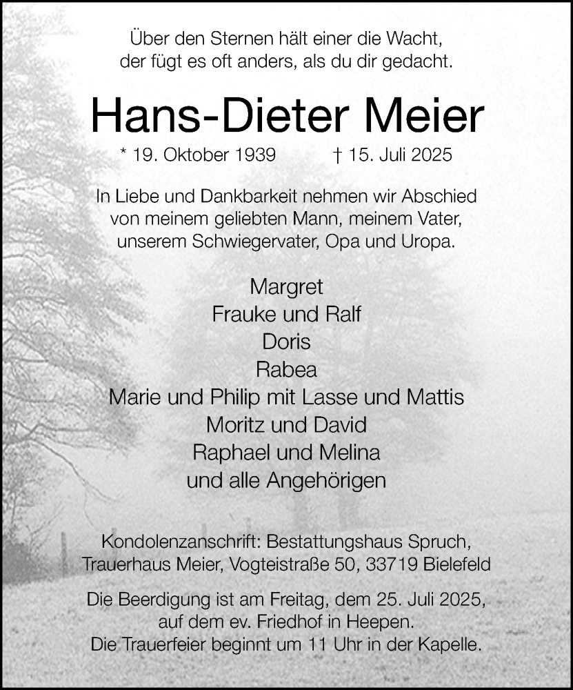 Hier finden Sie alle Traueranzeigen aus der Zeitung, die bisher für Hans-Dieter Meier erschienen sind. Weitere Traueranzeigen, die in der Zeitung erscheinen, werden hier ebenfalls aufgelistet
