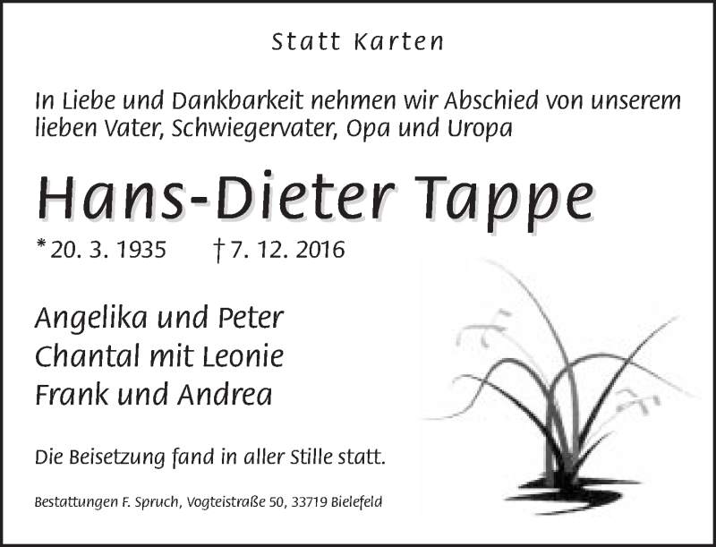 Hier finden Sie alle Traueranzeigen aus der Zeitung, die bisher für Hans-Dieter Tappe erschienen sind. Weitere Traueranzeigen, die in der Zeitung erscheinen, werden hier ebenfalls aufgelistet