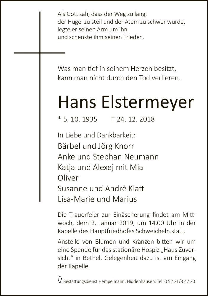 Hier finden Sie alle Traueranzeigen aus der Zeitung, die bisher für Hans Elstermeyer erschienen sind. Weitere Traueranzeigen, die in der Zeitung erscheinen, werden hier ebenfalls aufgelistet