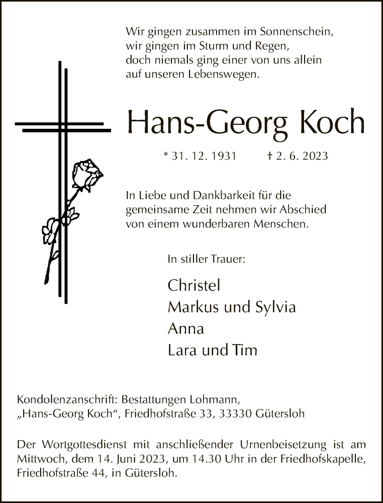 Hier finden Sie alle Traueranzeigen aus der Zeitung, die bisher für Hans-Georg Koch erschienen sind. Weitere Traueranzeigen, die in der Zeitung erscheinen, werden hier ebenfalls aufgelistet