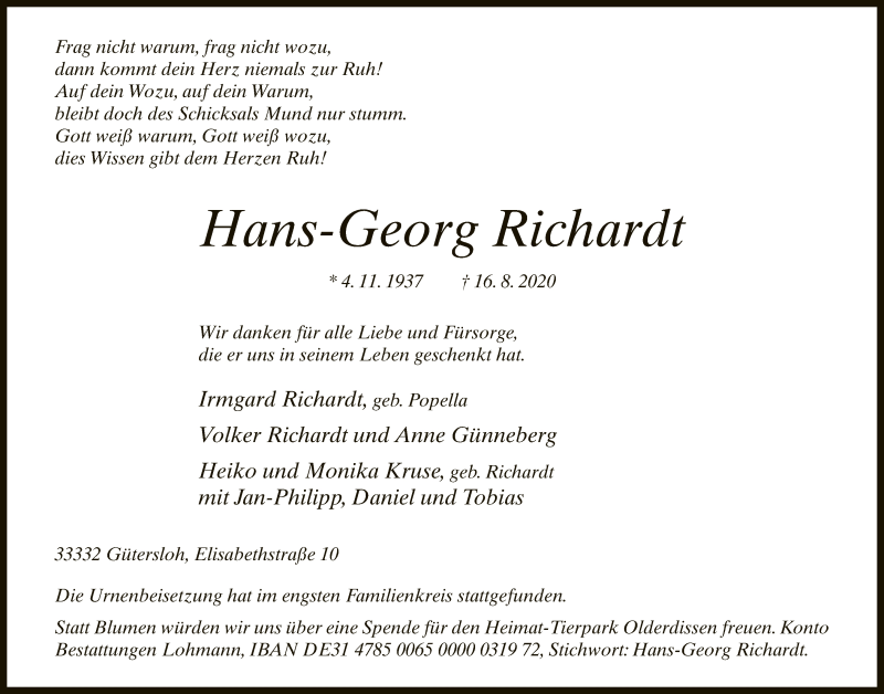 Hier finden Sie alle Traueranzeigen aus der Zeitung, die bisher für Hans-Georg Richardt erschienen sind. Weitere Traueranzeigen, die in der Zeitung erscheinen, werden hier ebenfalls aufgelistet