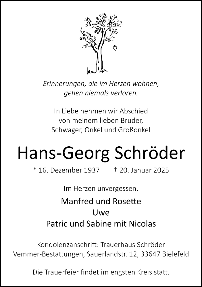 Hier finden Sie alle Traueranzeigen aus der Zeitung, die bisher für Hans-Georg Schröder erschienen sind. Weitere Traueranzeigen, die in der Zeitung erscheinen, werden hier ebenfalls aufgelistet