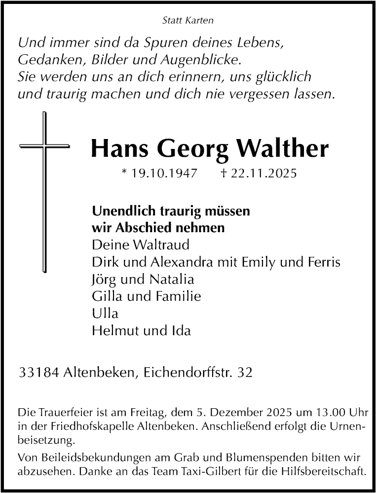 Hier finden Sie alle Traueranzeigen aus der Zeitung, die bisher für Hans Georg Walther erschienen sind. Weitere Traueranzeigen, die in der Zeitung erscheinen, werden hier ebenfalls aufgelistet