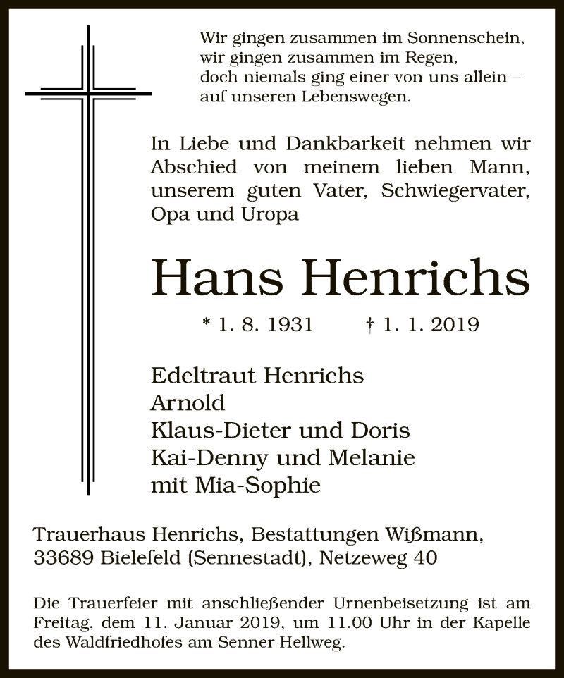 Hier finden Sie alle Traueranzeigen aus der Zeitung, die bisher für Hans Henrichs erschienen sind. Weitere Traueranzeigen, die in der Zeitung erscheinen, werden hier ebenfalls aufgelistet