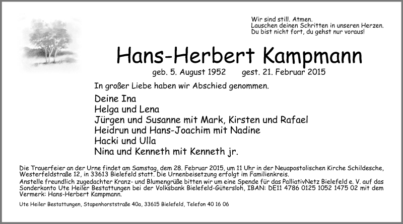 Hier finden Sie alle Traueranzeigen aus der Zeitung, die bisher für Hans-Herbert Kampmann erschienen sind. Weitere Traueranzeigen, die in der Zeitung erscheinen, werden hier ebenfalls aufgelistet