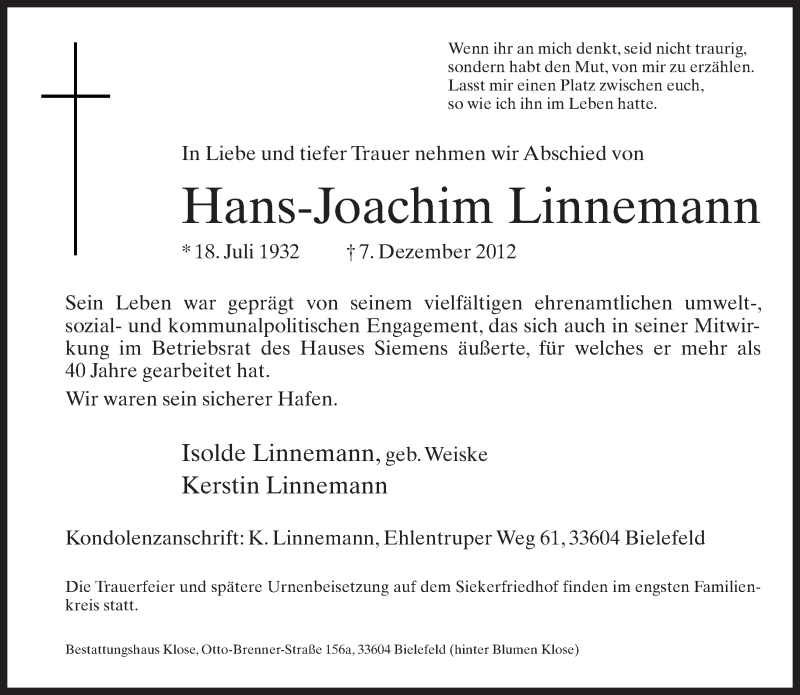 Hier finden Sie alle Traueranzeigen aus der Zeitung, die bisher für Hans-Joachim Linnemann erschienen sind. Weitere Traueranzeigen, die in der Zeitung erscheinen, werden hier ebenfalls aufgelistet