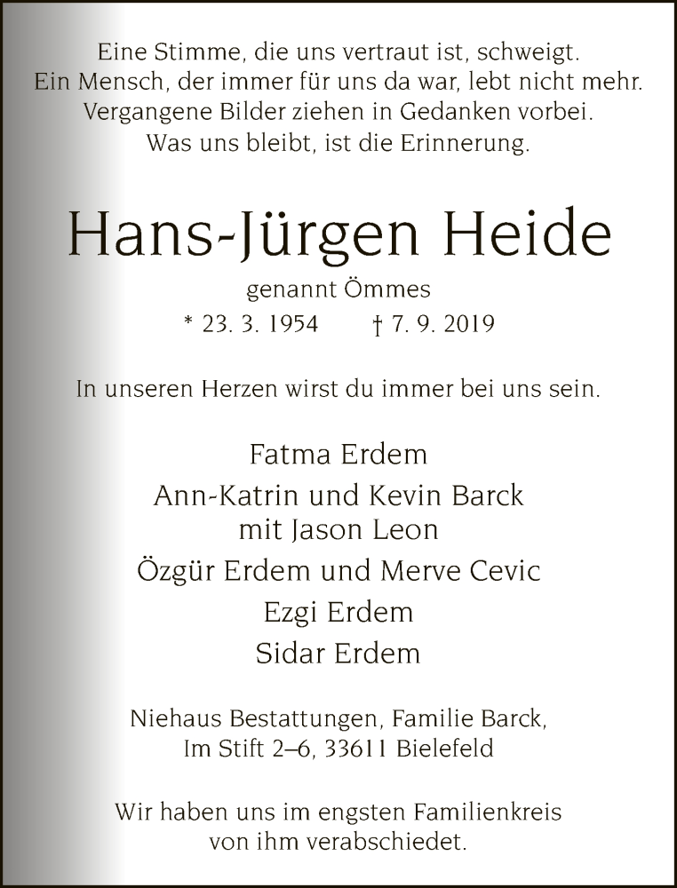 Hier finden Sie alle Traueranzeigen aus der Zeitung, die bisher für Hans-Jürgen Heide erschienen sind. Weitere Traueranzeigen, die in der Zeitung erscheinen, werden hier ebenfalls aufgelistet