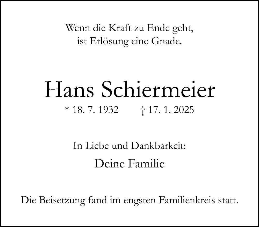 Hier finden Sie alle Traueranzeigen aus der Zeitung, die bisher für Hans Schiermeier erschienen sind. Weitere Traueranzeigen, die in der Zeitung erscheinen, werden hier ebenfalls aufgelistet