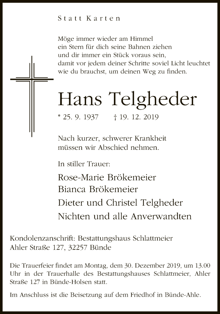 Hier finden Sie alle Traueranzeigen aus der Zeitung, die bisher für Hans Telgheder erschienen sind. Weitere Traueranzeigen, die in der Zeitung erscheinen, werden hier ebenfalls aufgelistet