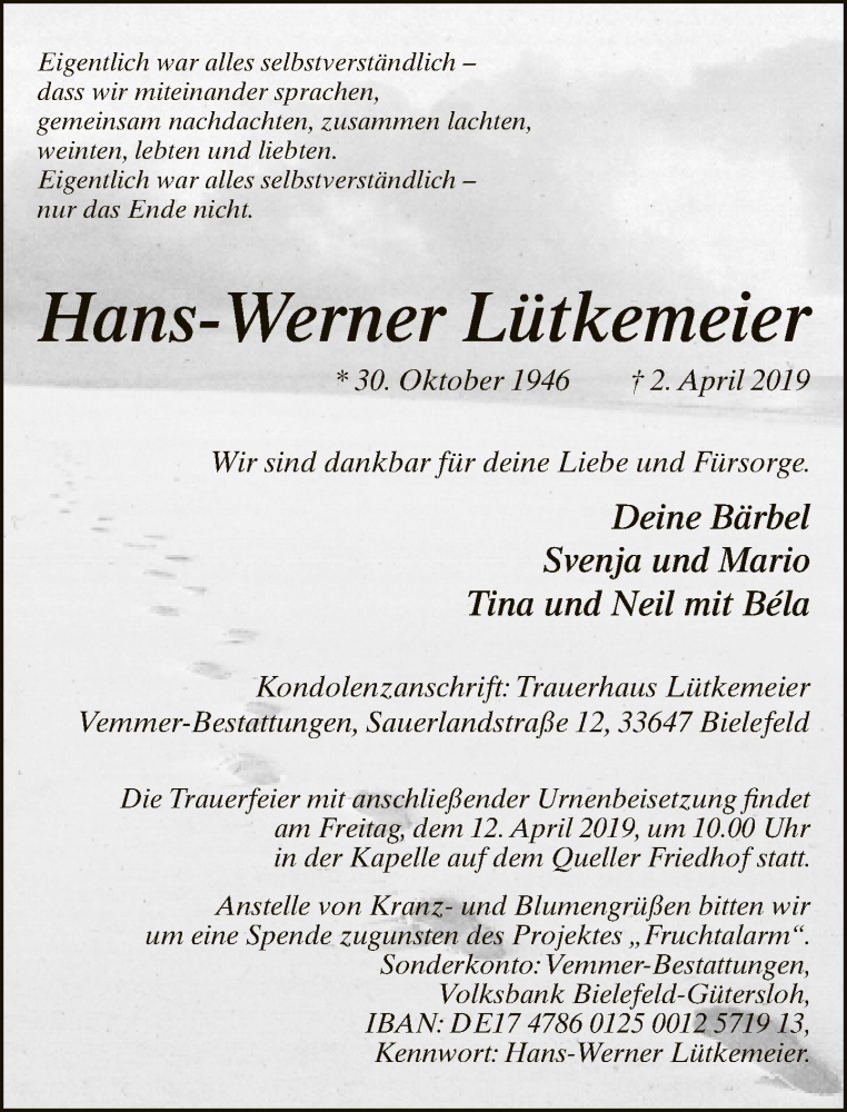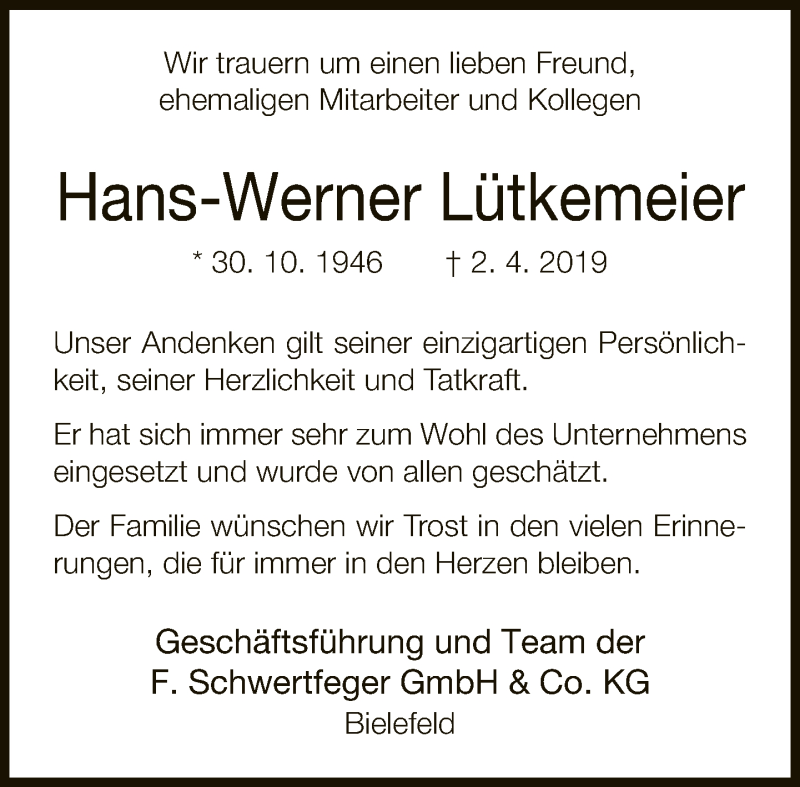 Hier finden Sie alle Traueranzeigen aus der Zeitung, die bisher für Hans-Werner Lütkemeier erschienen sind. Weitere Traueranzeigen, die in der Zeitung erscheinen, werden hier ebenfalls aufgelistet