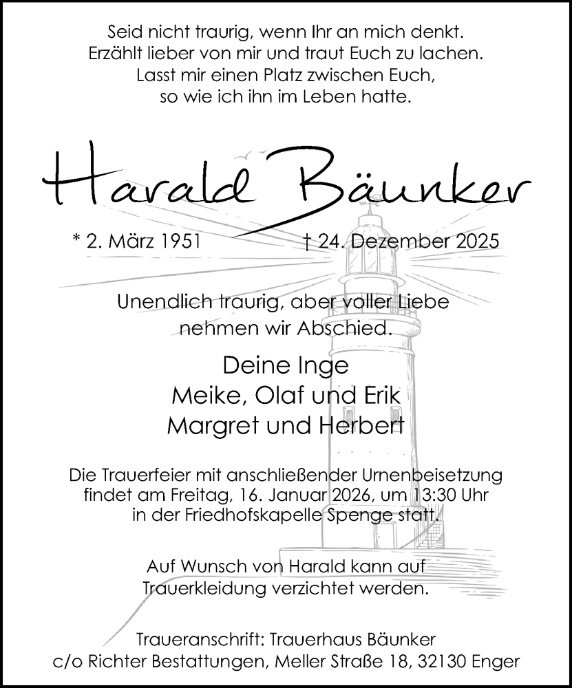 Hier finden Sie alle Traueranzeigen aus der Zeitung, die bisher für Harald Bäunker erschienen sind. Weitere Traueranzeigen, die in der Zeitung erscheinen, werden hier ebenfalls aufgelistet