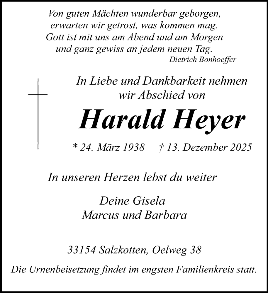 Hier finden Sie alle Traueranzeigen aus der Zeitung, die bisher für Harald Heyer erschienen sind. Weitere Traueranzeigen, die in der Zeitung erscheinen, werden hier ebenfalls aufgelistet