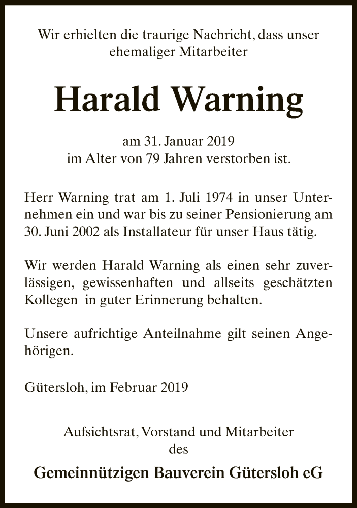 Hier finden Sie alle Traueranzeigen aus der Zeitung, die bisher für Harald Warning erschienen sind. Weitere Traueranzeigen, die in der Zeitung erscheinen, werden hier ebenfalls aufgelistet