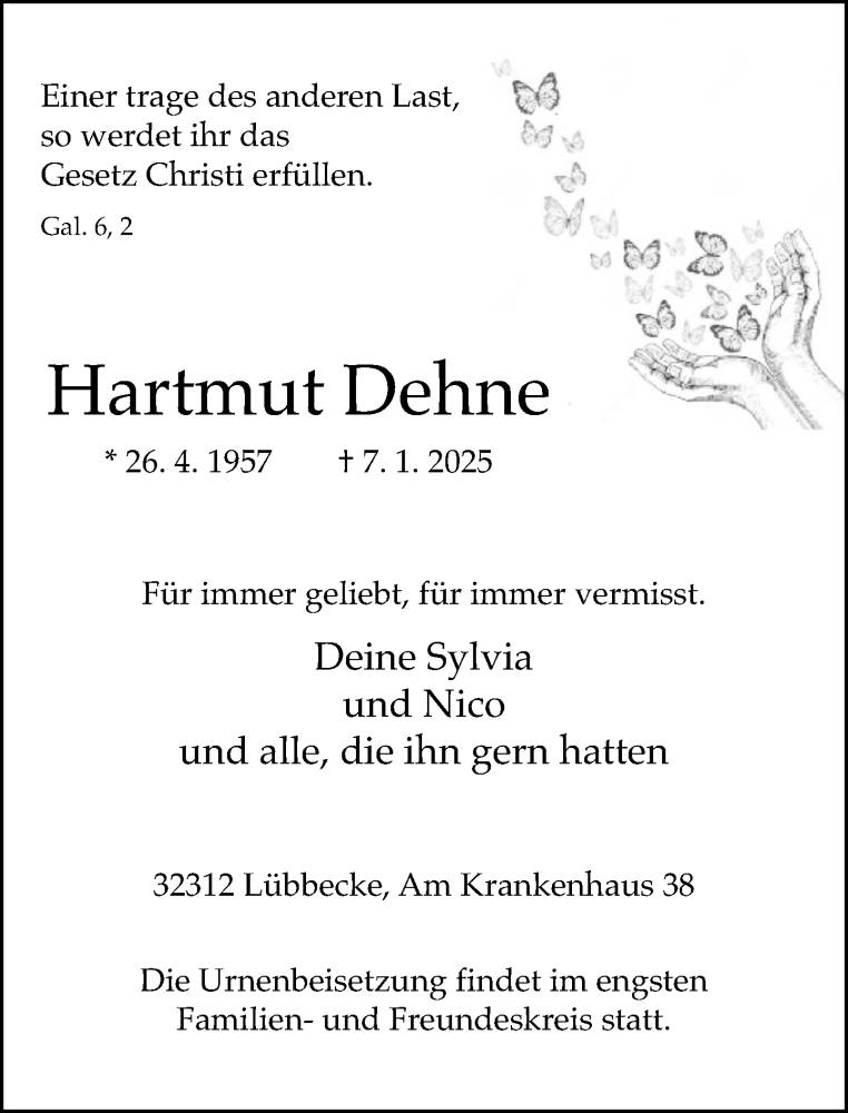 Hier finden Sie alle Traueranzeigen aus der Zeitung, die bisher für Hartmut Dehne erschienen sind. Weitere Traueranzeigen, die in der Zeitung erscheinen, werden hier ebenfalls aufgelistet