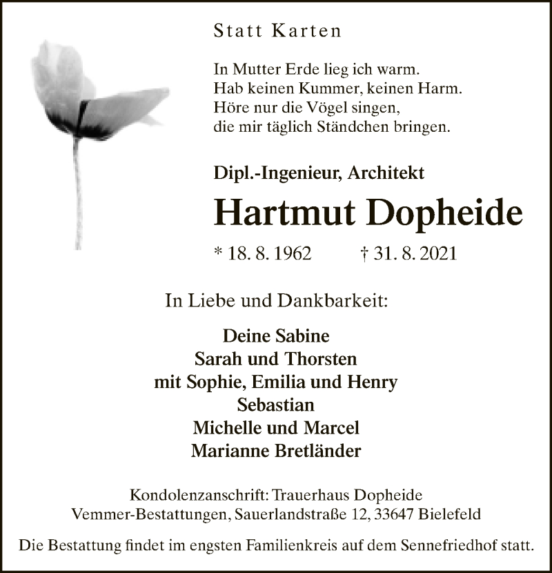 Hier finden Sie alle Traueranzeigen aus der Zeitung, die bisher für Hartmut Dopheide erschienen sind. Weitere Traueranzeigen, die in der Zeitung erscheinen, werden hier ebenfalls aufgelistet