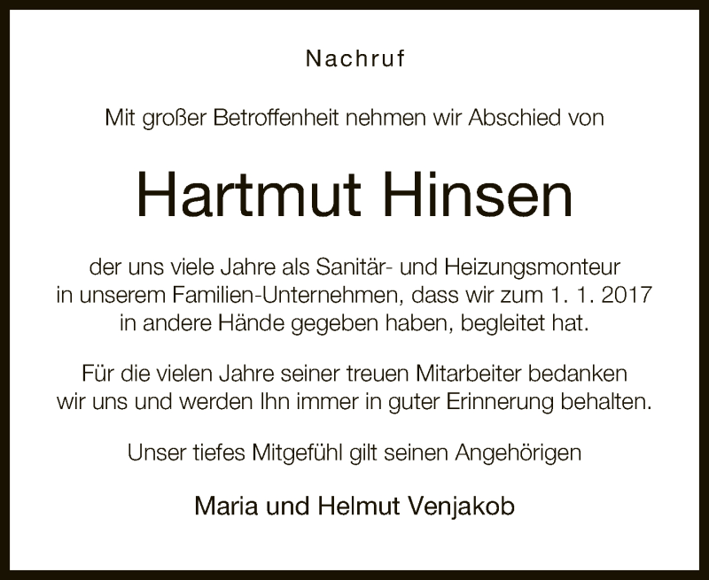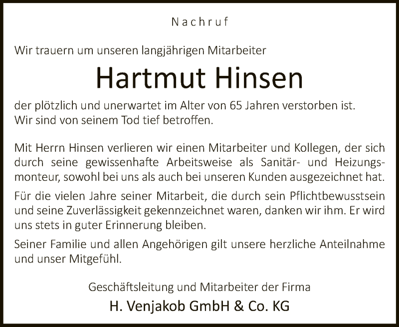 Hier finden Sie alle Traueranzeigen aus der Zeitung, die bisher für Hartmut Hinsen erschienen sind. Weitere Traueranzeigen, die in der Zeitung erscheinen, werden hier ebenfalls aufgelistet