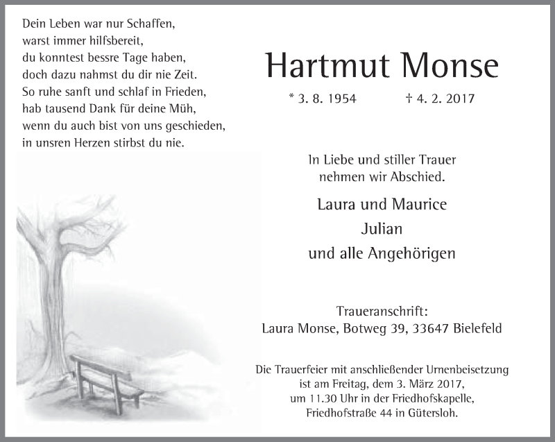 Hier finden Sie alle Traueranzeigen aus der Zeitung, die bisher für Hartmut Monse erschienen sind. Weitere Traueranzeigen, die in der Zeitung erscheinen, werden hier ebenfalls aufgelistet