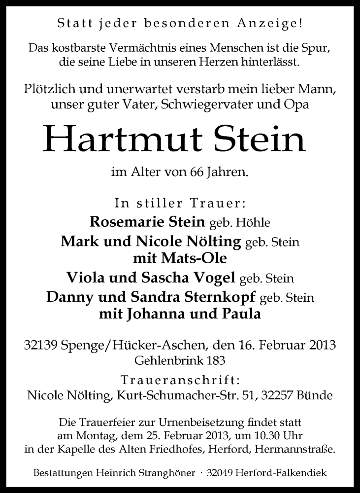 Hier finden Sie alle Traueranzeigen aus der Zeitung, die bisher für Hartmut Stein erschienen sind. Weitere Traueranzeigen, die in der Zeitung erscheinen, werden hier ebenfalls aufgelistet