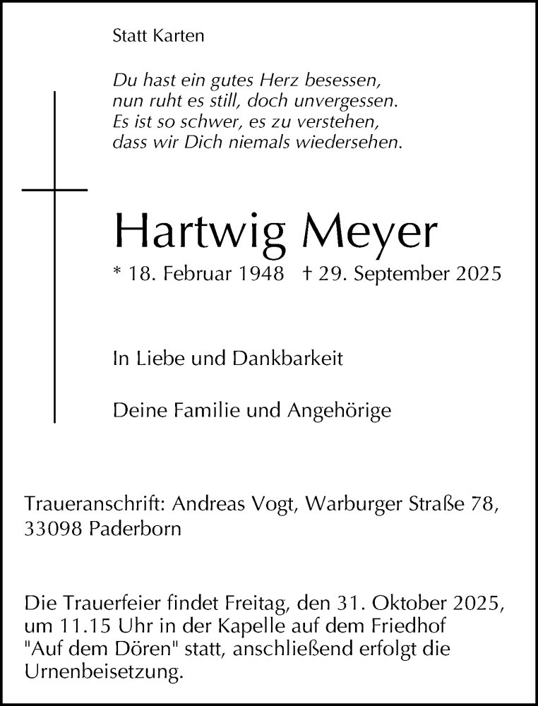 Hier finden Sie alle Traueranzeigen aus der Zeitung, die bisher für Hartwig Meyer erschienen sind. Weitere Traueranzeigen, die in der Zeitung erscheinen, werden hier ebenfalls aufgelistet