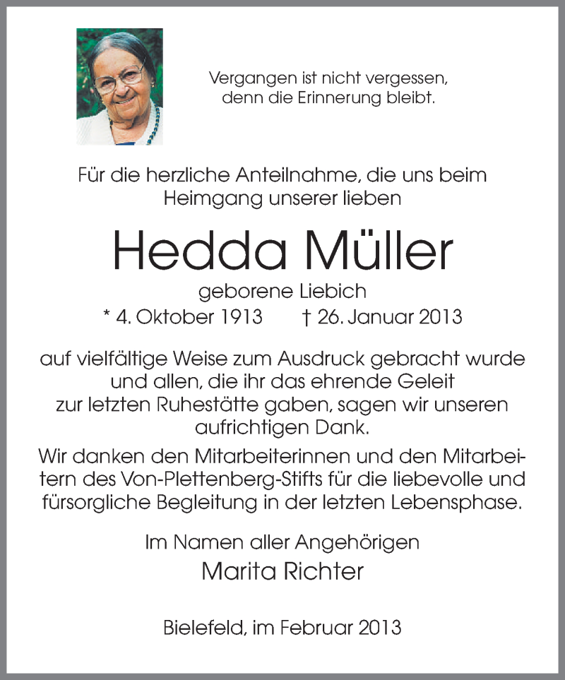 Hier finden Sie alle Traueranzeigen aus der Zeitung, die bisher für Hedda Müller erschienen sind. Weitere Traueranzeigen, die in der Zeitung erscheinen, werden hier ebenfalls aufgelistet