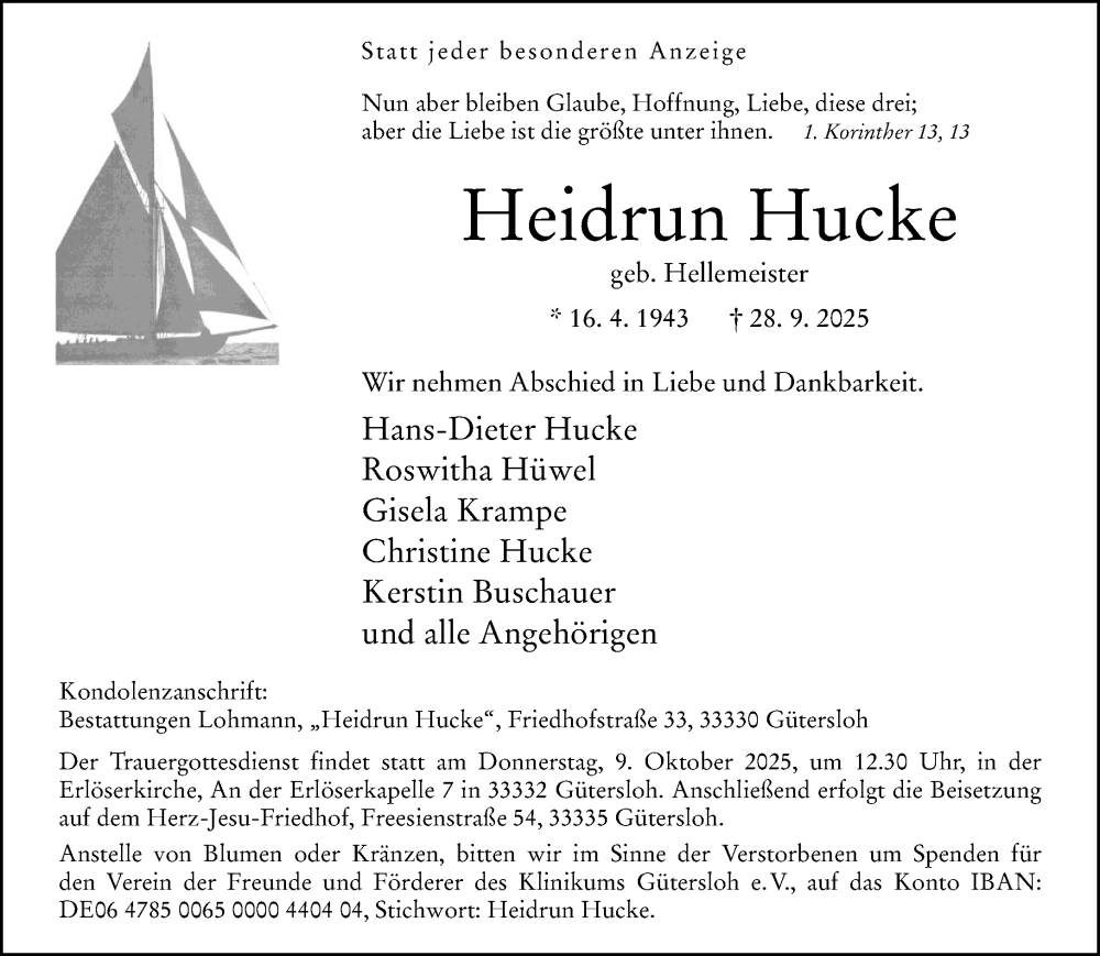 Hier finden Sie alle Traueranzeigen aus der Zeitung, die bisher für Heidrun Hucke erschienen sind. Weitere Traueranzeigen, die in der Zeitung erscheinen, werden hier ebenfalls aufgelistet