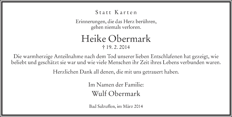 Hier finden Sie alle Traueranzeigen aus der Zeitung, die bisher für Heike Obermark erschienen sind. Weitere Traueranzeigen, die in der Zeitung erscheinen, werden hier ebenfalls aufgelistet