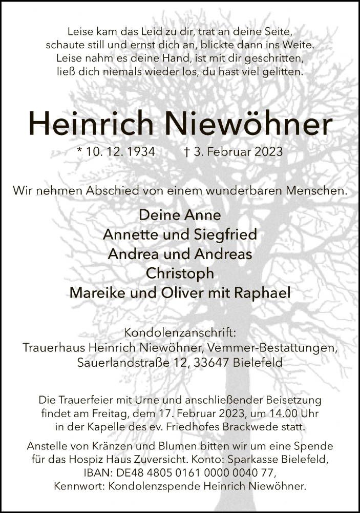 Hier finden Sie alle Traueranzeigen aus der Zeitung, die bisher für Heinrich Niewöhner erschienen sind. Weitere Traueranzeigen, die in der Zeitung erscheinen, werden hier ebenfalls aufgelistet