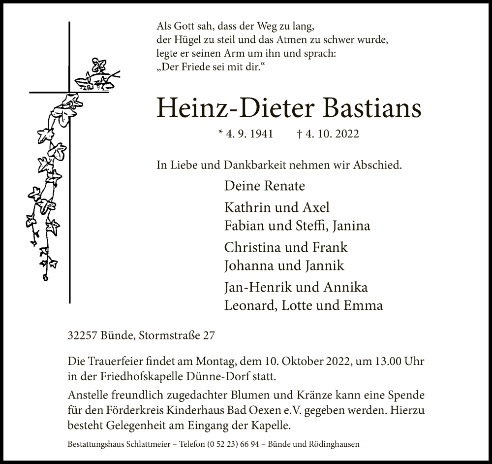 Hier finden Sie alle Traueranzeigen aus der Zeitung, die bisher für Heinz-Dieter Bastians erschienen sind. Weitere Traueranzeigen, die in der Zeitung erscheinen, werden hier ebenfalls aufgelistet