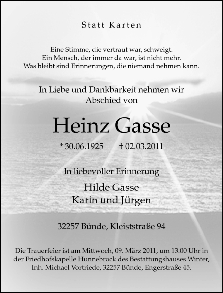 Hier finden Sie alle Traueranzeigen aus der Zeitung, die bisher für Heinz Gasse erschienen sind. Weitere Traueranzeigen, die in der Zeitung erscheinen, werden hier ebenfalls aufgelistet