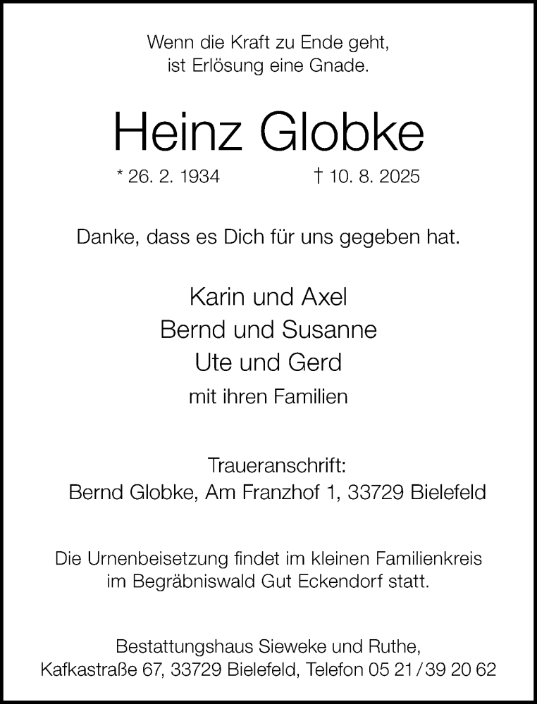 Hier finden Sie alle Traueranzeigen aus der Zeitung, die bisher für Heinz Globke erschienen sind. Weitere Traueranzeigen, die in der Zeitung erscheinen, werden hier ebenfalls aufgelistet
