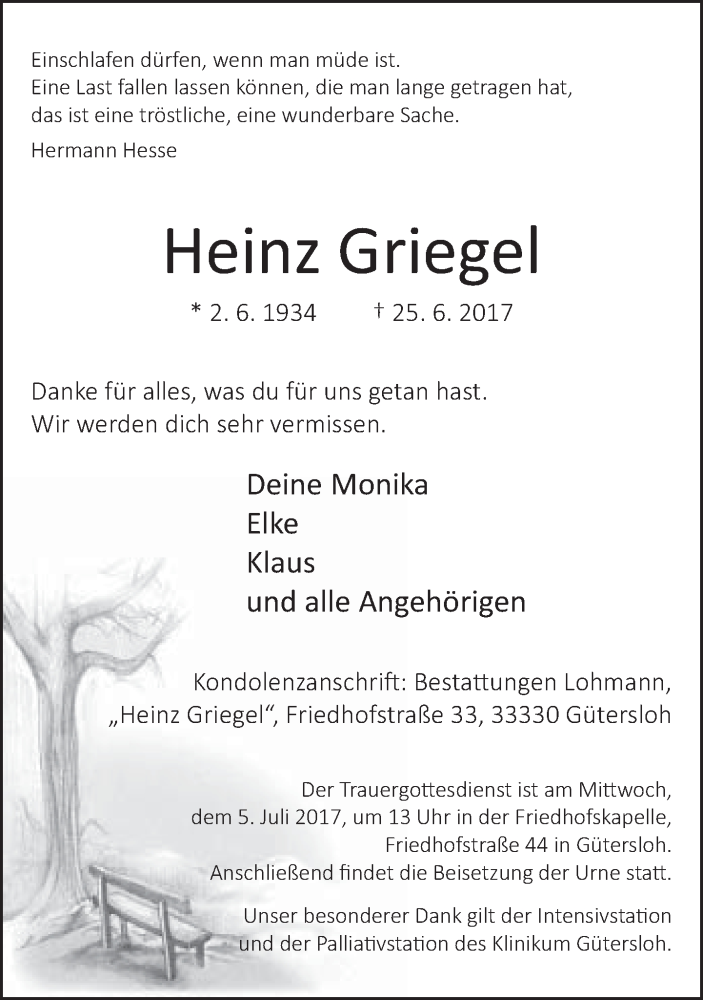 Hier finden Sie alle Traueranzeigen aus der Zeitung, die bisher für Heinz Griegel erschienen sind. Weitere Traueranzeigen, die in der Zeitung erscheinen, werden hier ebenfalls aufgelistet