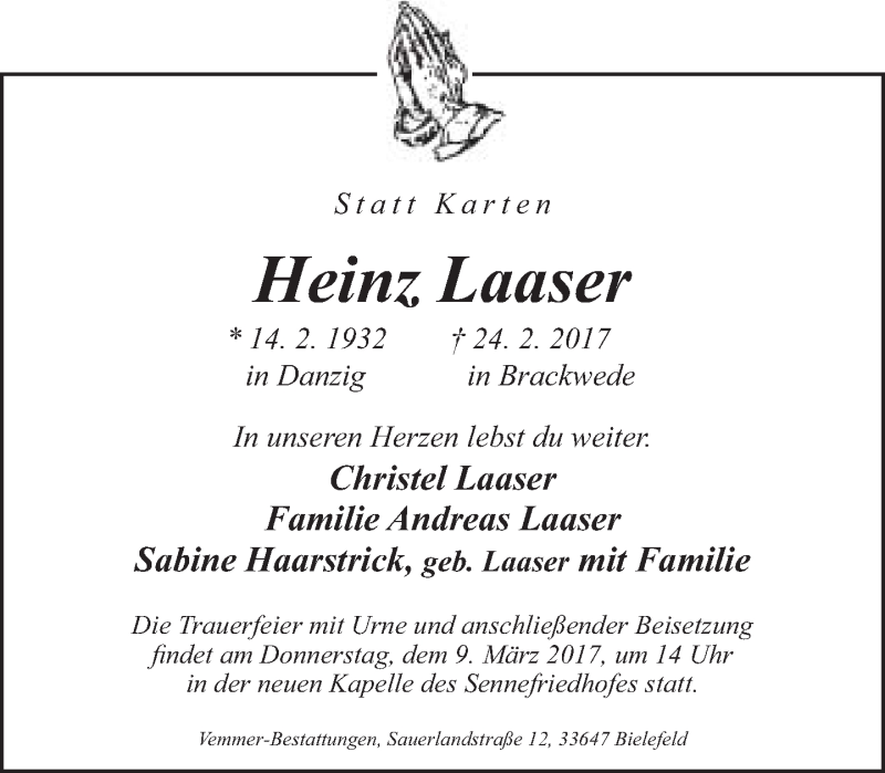 Hier finden Sie alle Traueranzeigen aus der Zeitung, die bisher für Heinz Laaser erschienen sind. Weitere Traueranzeigen, die in der Zeitung erscheinen, werden hier ebenfalls aufgelistet