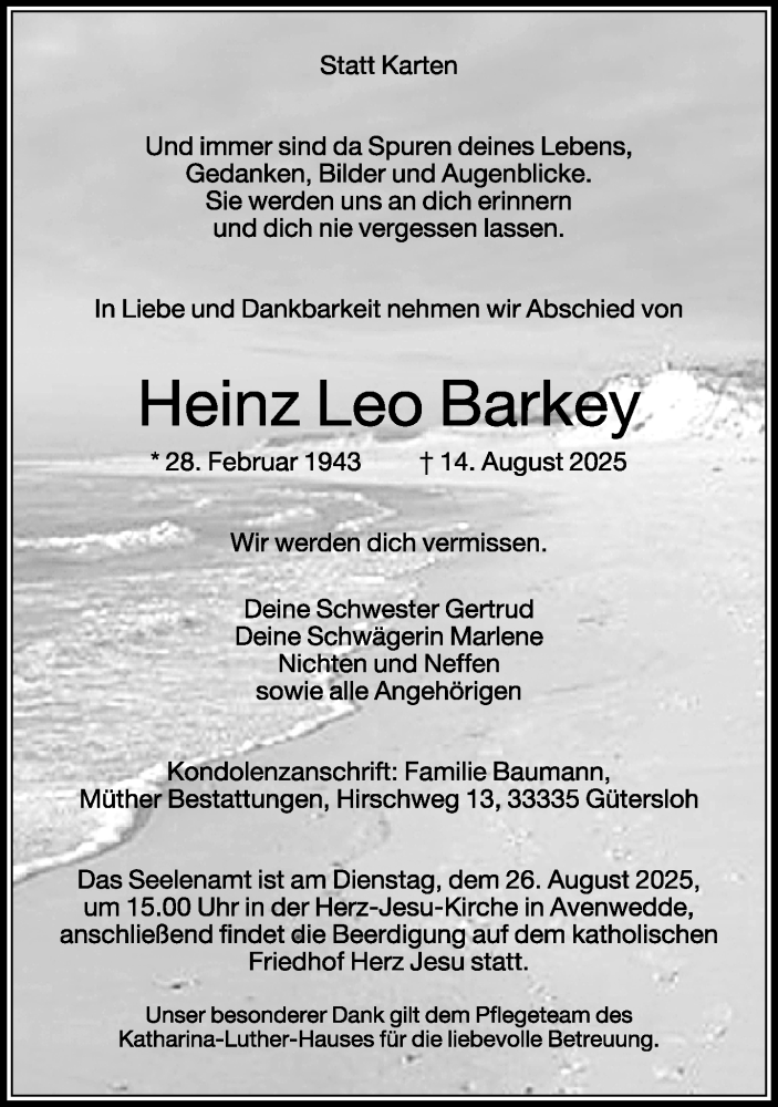 Hier finden Sie alle Traueranzeigen aus der Zeitung, die bisher für Heinz Leo Barkey erschienen sind. Weitere Traueranzeigen, die in der Zeitung erscheinen, werden hier ebenfalls aufgelistet