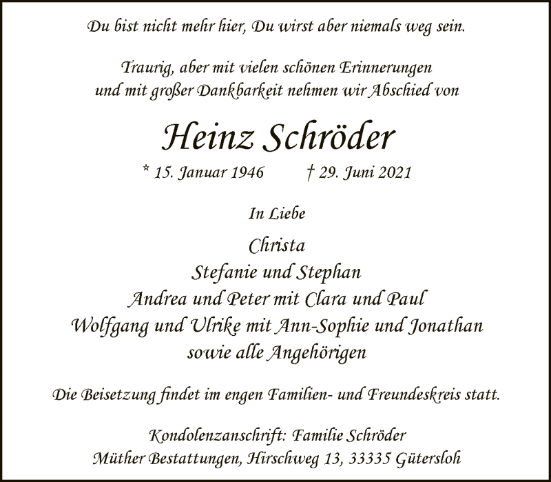 Hier finden Sie alle Traueranzeigen aus der Zeitung, die bisher für Heinz Schröder erschienen sind. Weitere Traueranzeigen, die in der Zeitung erscheinen, werden hier ebenfalls aufgelistet