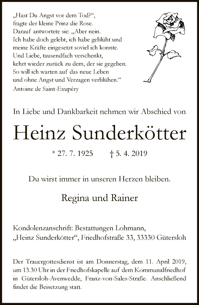 Hier finden Sie alle Traueranzeigen aus der Zeitung, die bisher für Heinz Sunderkötter erschienen sind. Weitere Traueranzeigen, die in der Zeitung erscheinen, werden hier ebenfalls aufgelistet