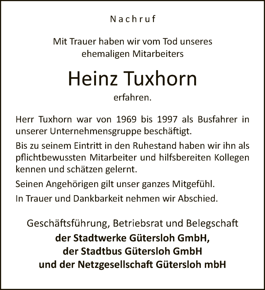 Hier finden Sie alle Traueranzeigen aus der Zeitung, die bisher für Heinz Tuxhorn erschienen sind. Weitere Traueranzeigen, die in der Zeitung erscheinen, werden hier ebenfalls aufgelistet