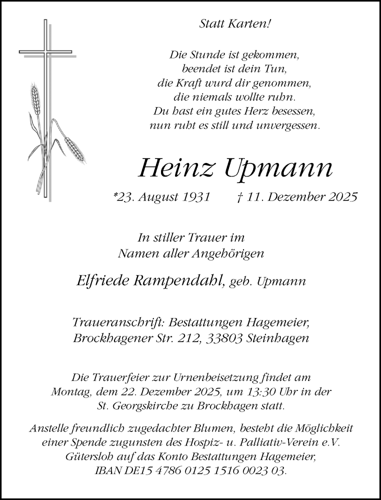 Hier finden Sie alle Traueranzeigen aus der Zeitung, die bisher für Heinz Upmann erschienen sind. Weitere Traueranzeigen, die in der Zeitung erscheinen, werden hier ebenfalls aufgelistet