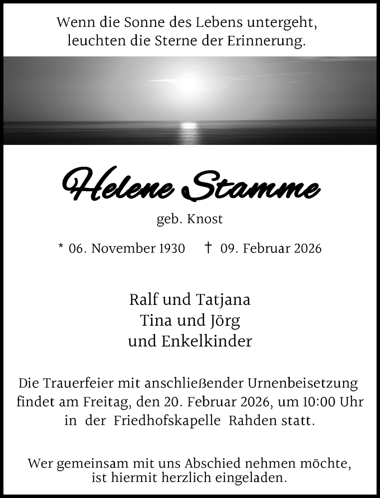 Hier finden Sie alle Traueranzeigen aus der Zeitung, die bisher für Helene Stamme erschienen sind. Weitere Traueranzeigen, die in der Zeitung erscheinen, werden hier ebenfalls aufgelistet