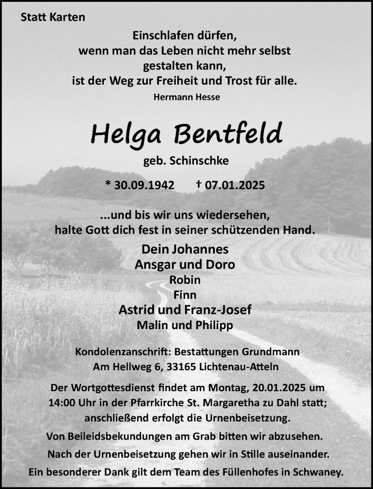 Hier finden Sie alle Traueranzeigen aus der Zeitung, die bisher für Helga Bentfeld erschienen sind. Weitere Traueranzeigen, die in der Zeitung erscheinen, werden hier ebenfalls aufgelistet