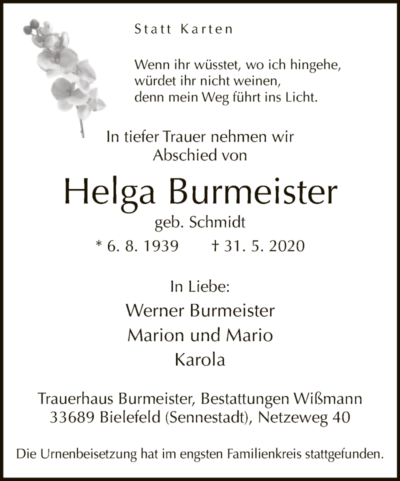 Hier finden Sie alle Traueranzeigen aus der Zeitung, die bisher für Helga Burmeister erschienen sind. Weitere Traueranzeigen, die in der Zeitung erscheinen, werden hier ebenfalls aufgelistet
