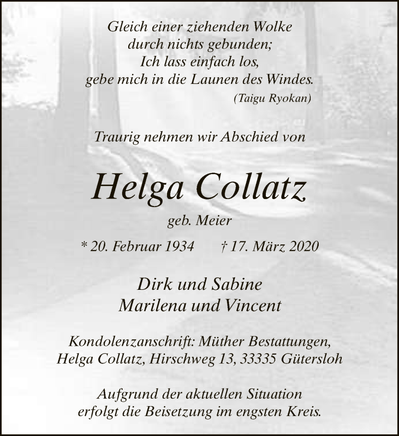 Hier finden Sie alle Traueranzeigen aus der Zeitung, die bisher für Helga Collatz erschienen sind. Weitere Traueranzeigen, die in der Zeitung erscheinen, werden hier ebenfalls aufgelistet