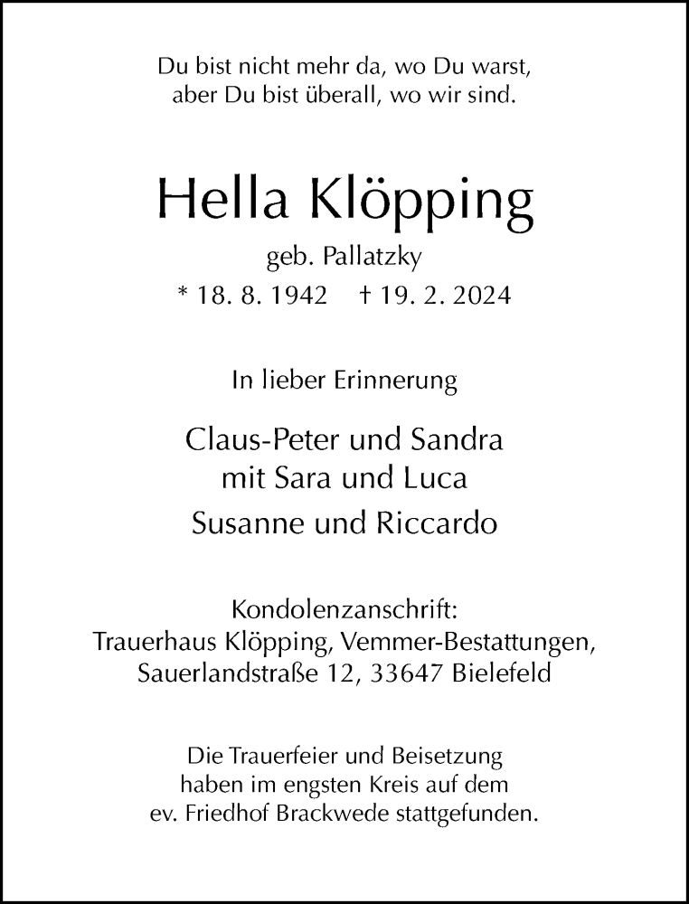 Hier finden Sie alle Traueranzeigen aus der Zeitung, die bisher für Hella Klöpping erschienen sind. Weitere Traueranzeigen, die in der Zeitung erscheinen, werden hier ebenfalls aufgelistet