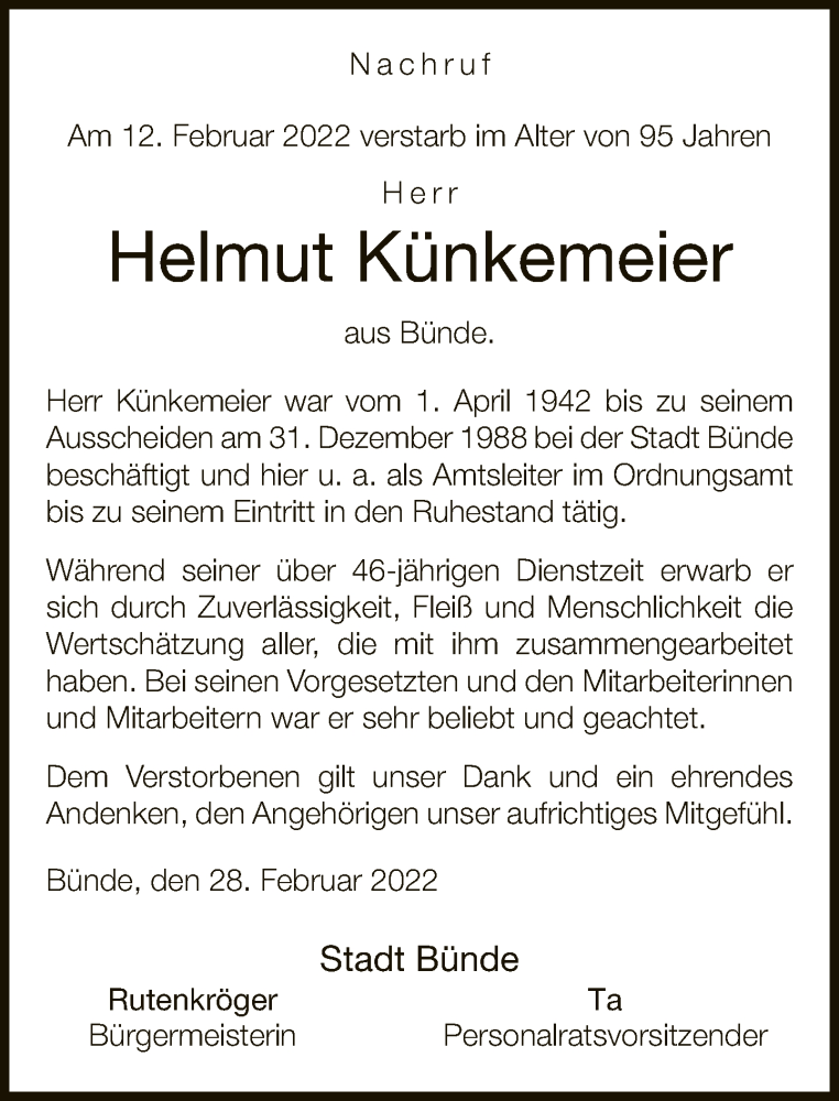 Hier finden Sie alle Traueranzeigen aus der Zeitung, die bisher für Helmut Künkemeier erschienen sind. Weitere Traueranzeigen, die in der Zeitung erscheinen, werden hier ebenfalls aufgelistet